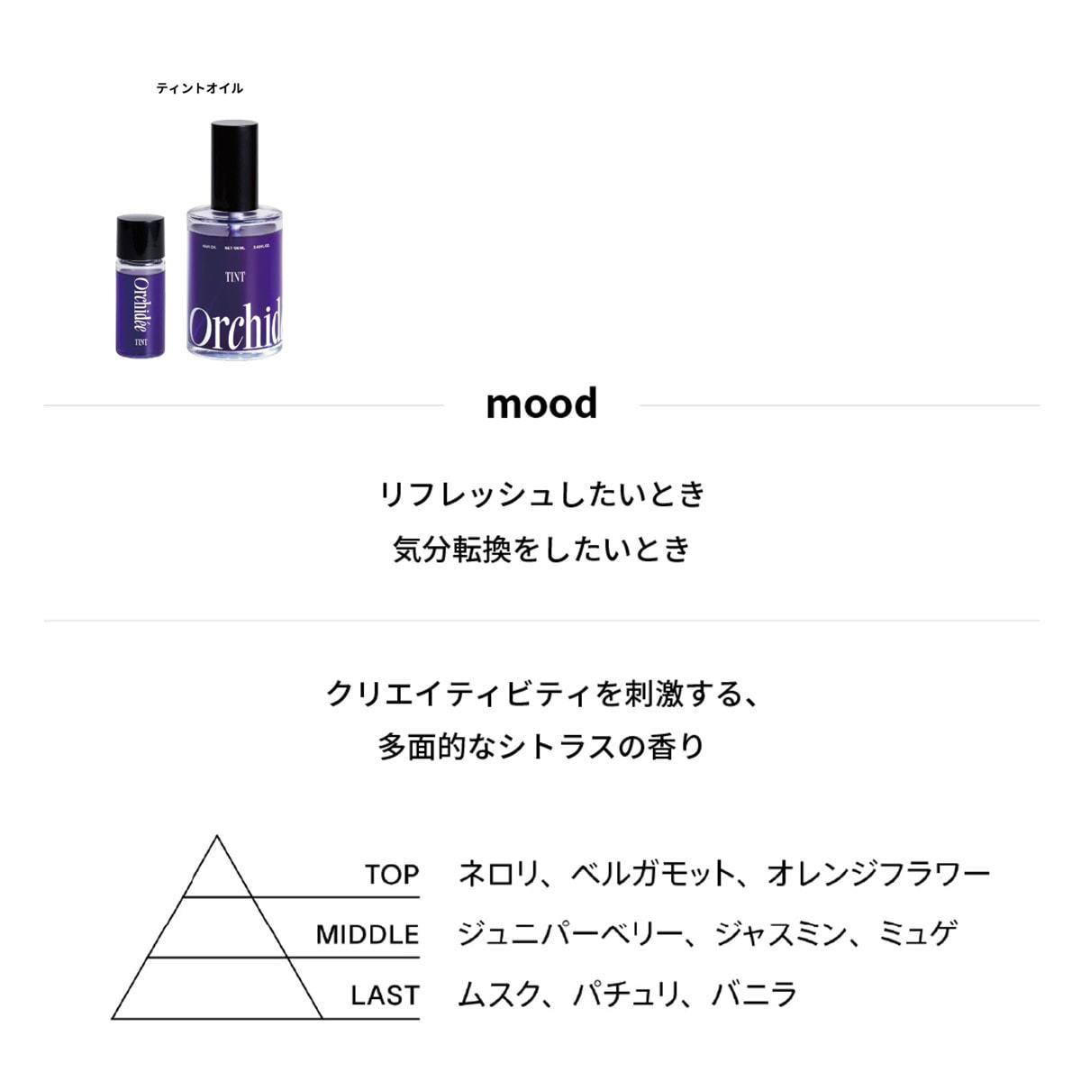 華やかなネロリや爽快なベルガモットを主軸に、ジュニパーベリーやジャスミン、ミュゲなどの色っぽい甘さが絡み合い、上質なパチュリやバニラで個性を解き放つ。甘みや苦みだけに留まらず、次から次へと表情を変えてゆく香りは、思考に深みを生み出す。多面的な香調が、あなたの中に眠るクリエイティビティを呼び覚まします。